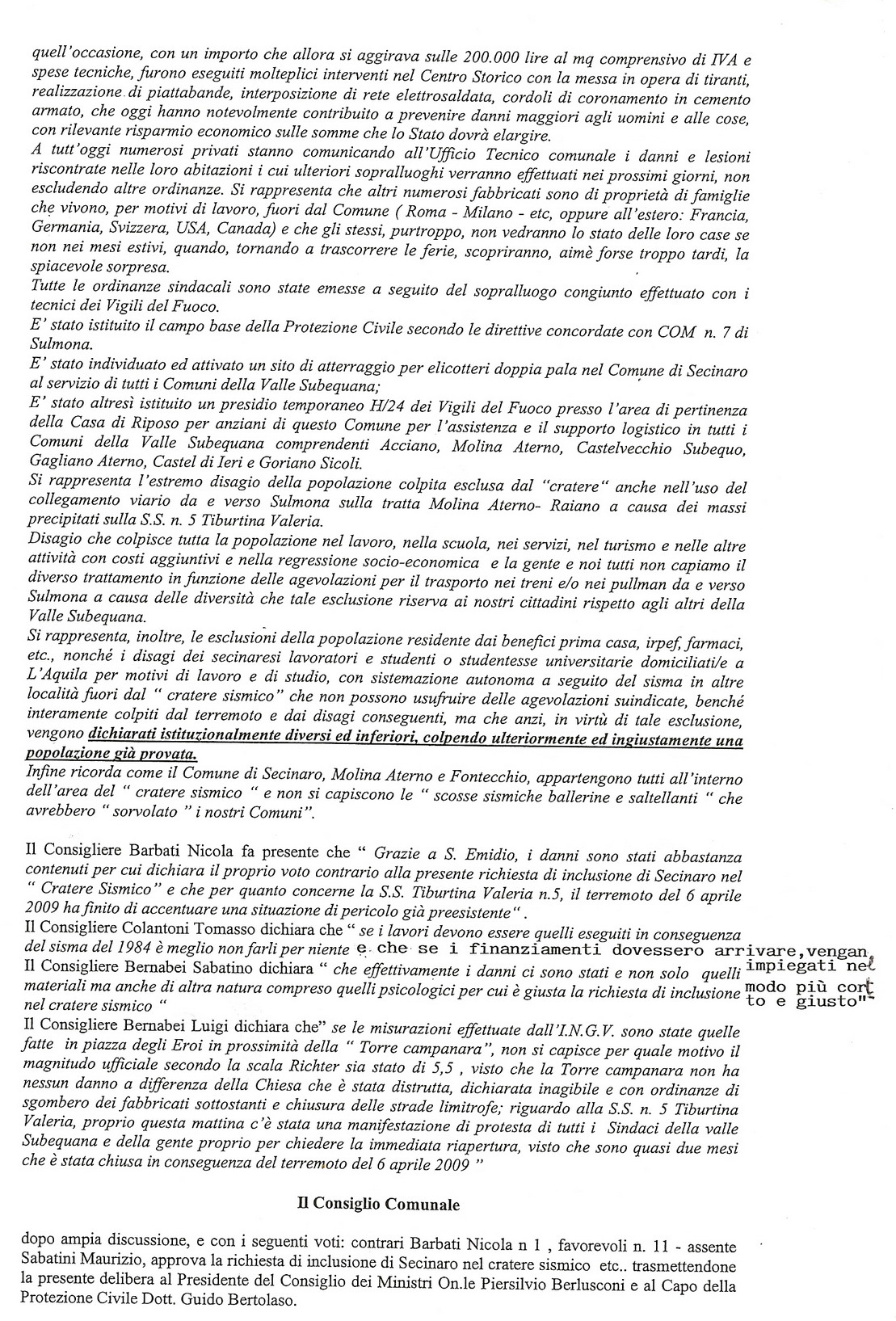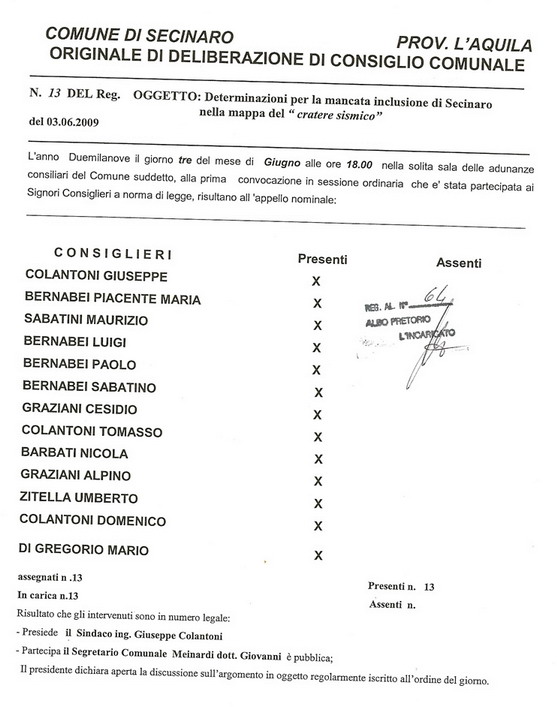 Infatti, proprio di fronte all’incrocio tra Via Sirente con la provinciale 11, in località “Valle Variano”, sono già iniziati i lavori di sbancamento per la realizzazione delle basi in cemento. Su queste saranno costruite le pareti delle casette. In tutto è prevista la realizzazione di 5 Map di cui 4 da 50 mq, e una da 70 mq. Le stesse, ultimate entro il mese din diembre del corrente anno, saranno destinate ad accogliere le famiglie, residenti nel comune, che hanno le case inagibili. In pratica si è puntato sui formati medi ed extra delle misure disponibili di Map. Cliccando in basso, si può scaricare a Delibera di Consiglio Comunale n. 13 del 3 giugno 2009 di richiesta alla Protezione Civile di inclusione del Comune di Secinaro nel Cratere Sismico, non votata alla unanimità dei presenti.